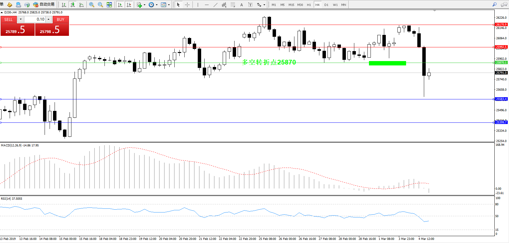 道琼斯指数DJ30—— 4小时K线图显示: