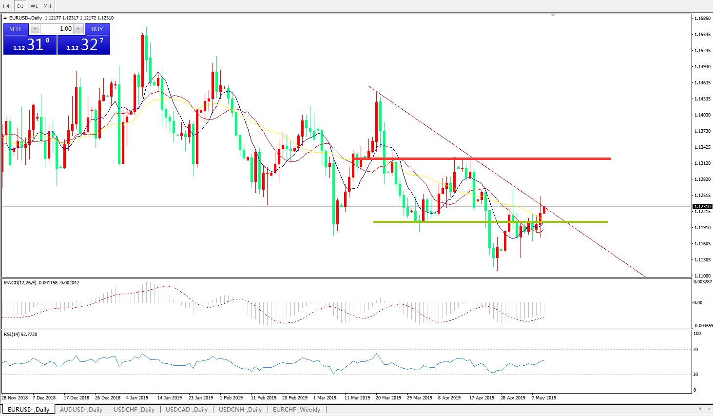 技术面简析:日图短期均线拐头上行,汇价突破多空转折区域压制上行试探下降趋势线的压制,MACD在0轴下方拐头上行且动能柱持续缩量,RSI缓步走高,预计汇将进一步走高。