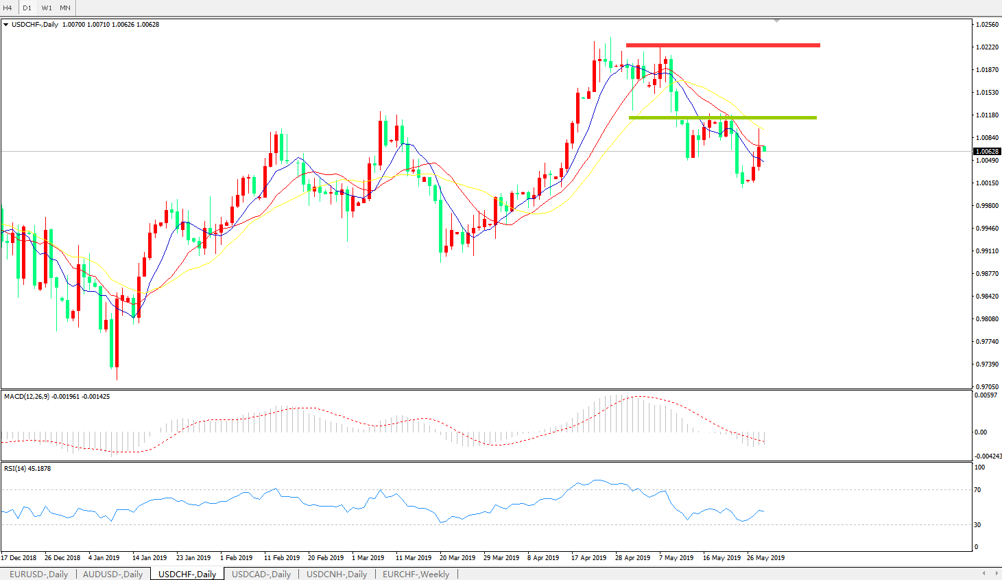 技术面简析:日线图均线呈有序空头排列,汇价昨日大阳线崛起,MACD下穿0轴且动能柱微缩量,RSI轻微反弹,预计汇价将承压下行。