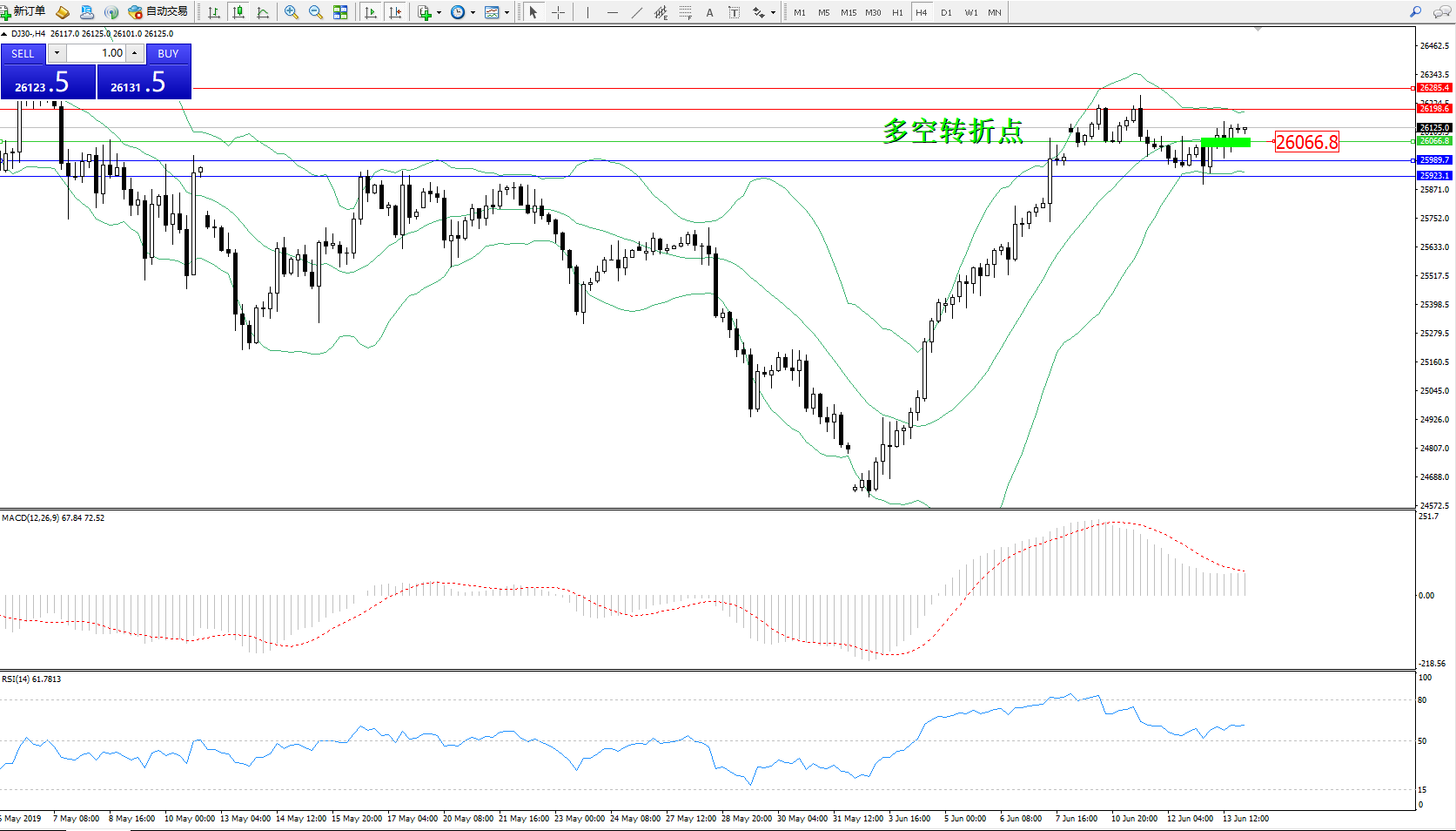 道琼斯指数DJ30—— 4小时K线图显示: