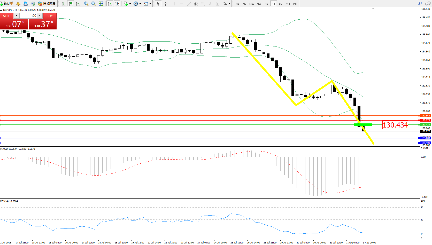 交易策略:130.434下方看跌,目标129.684129.401