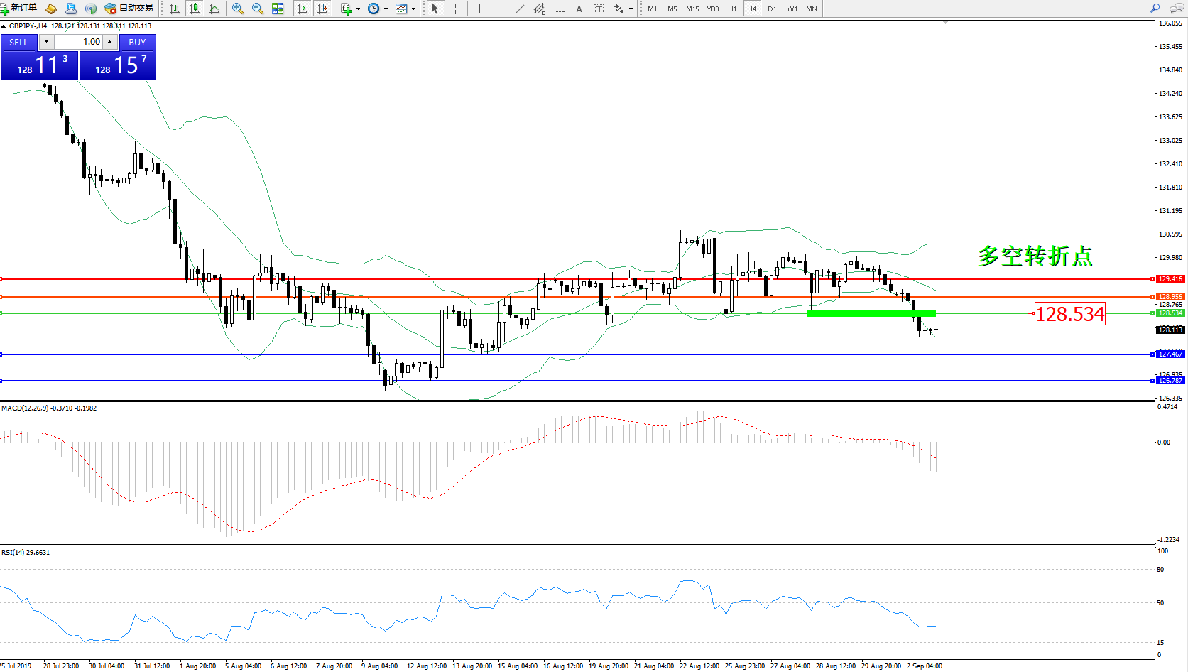 交易策略:128.534下方看跌,目标127.467、126.787