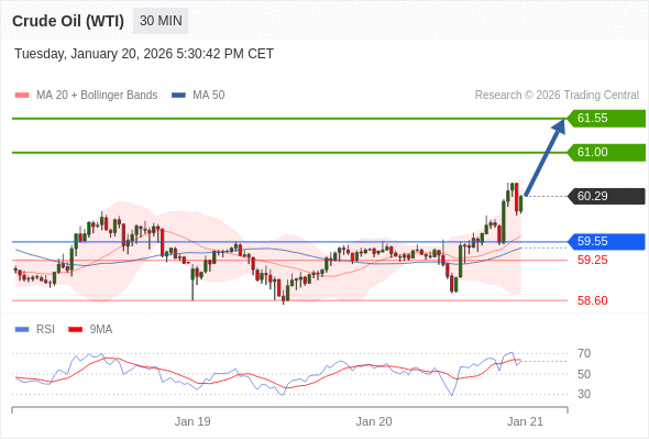在 59.55 之上,看涨,目标价位为 61.00 ,然后为 61.55 。