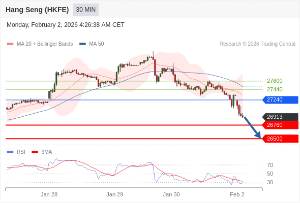 香港恒生指数期货 当日内: 存在压力。