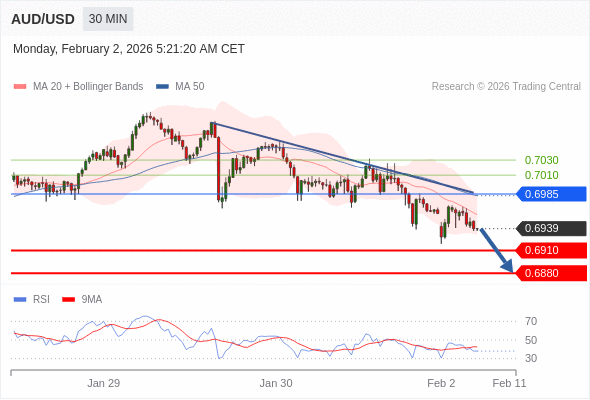 交易策略: 在 0.6985 之下,看跌,目标价位为 0.6910 ,然后为 0.6880 。