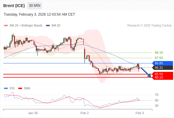 在 66.85 之下,看跌,目标价位为 65.50 ,然后为 65.10 。
