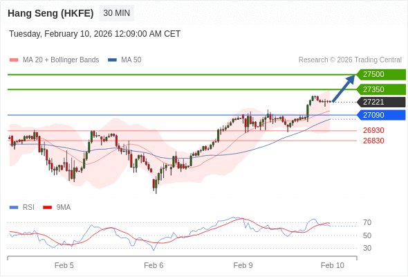 在 27090 之上,看涨,目标价位为 27350 ,然后为 27500 。