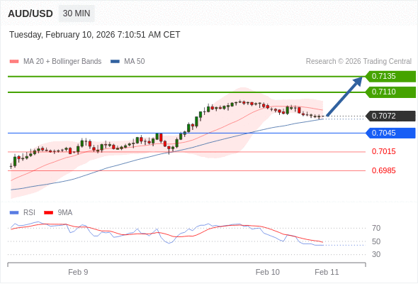 在 0.7045 之上,看涨,目标价位为 0.7110 ,然后为 0.7135 。