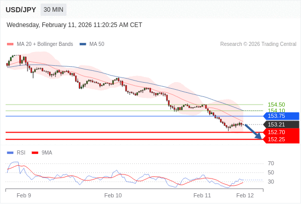 在 153.75 之下,看跌,目标价位为 152.70 ,然后为 152.25 。