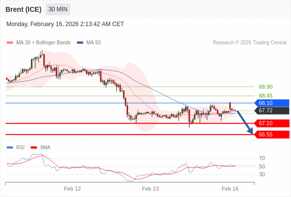 交易策略: 在 68.10 之下,看跌,目标价位为 67.10 ,然后为 66.55 。
