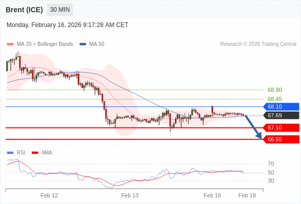 布伦特原油 (ICE) (J6) 当日内: 短期关键阻力位在68.10。