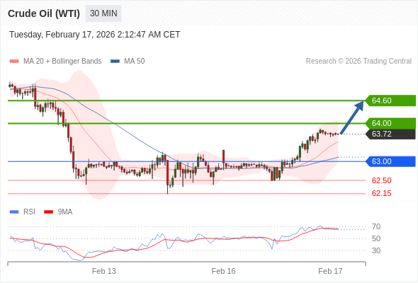 在 63.00 之上,看涨,目标价位为 64.00 ,然后为 64.60 。