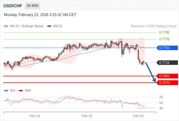 在 0.7750 之下,看跌,目标价位为 0.7685 ,然后为 0.7670 。