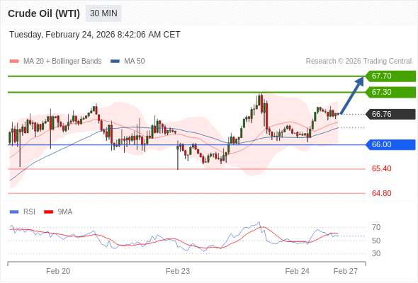 在 66.00 之上,看涨,目标价位为 67.30 ,然后为 67.70 。