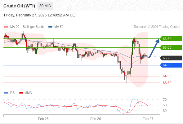 在 64.80 之上,看涨,目标价位为 66.00 ,然后为 66.60 。