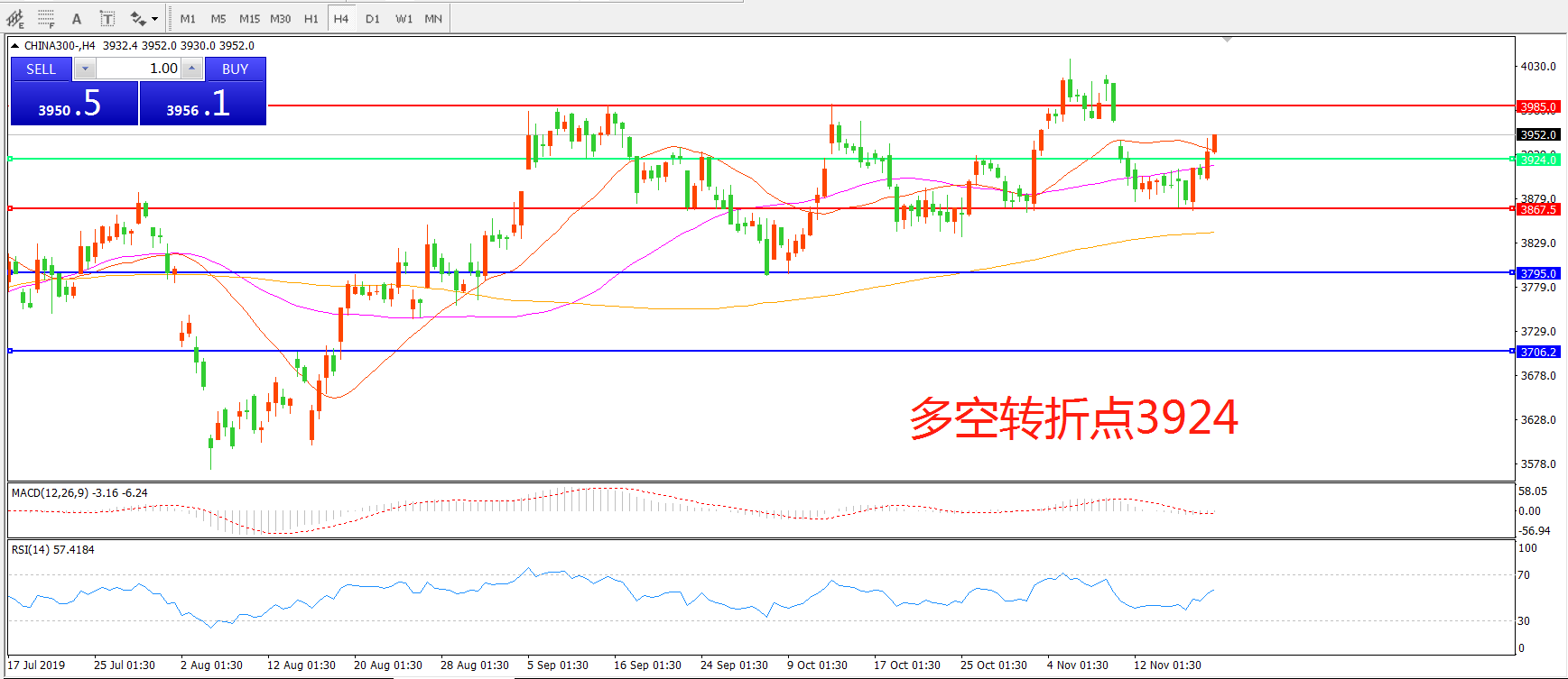 4小时图看,沪深300延续强势,触碰3867.5后强势突破3924阻力,均线系统走平,MACD红柱增加,RSI指标向上,日内延续上行概率较大。