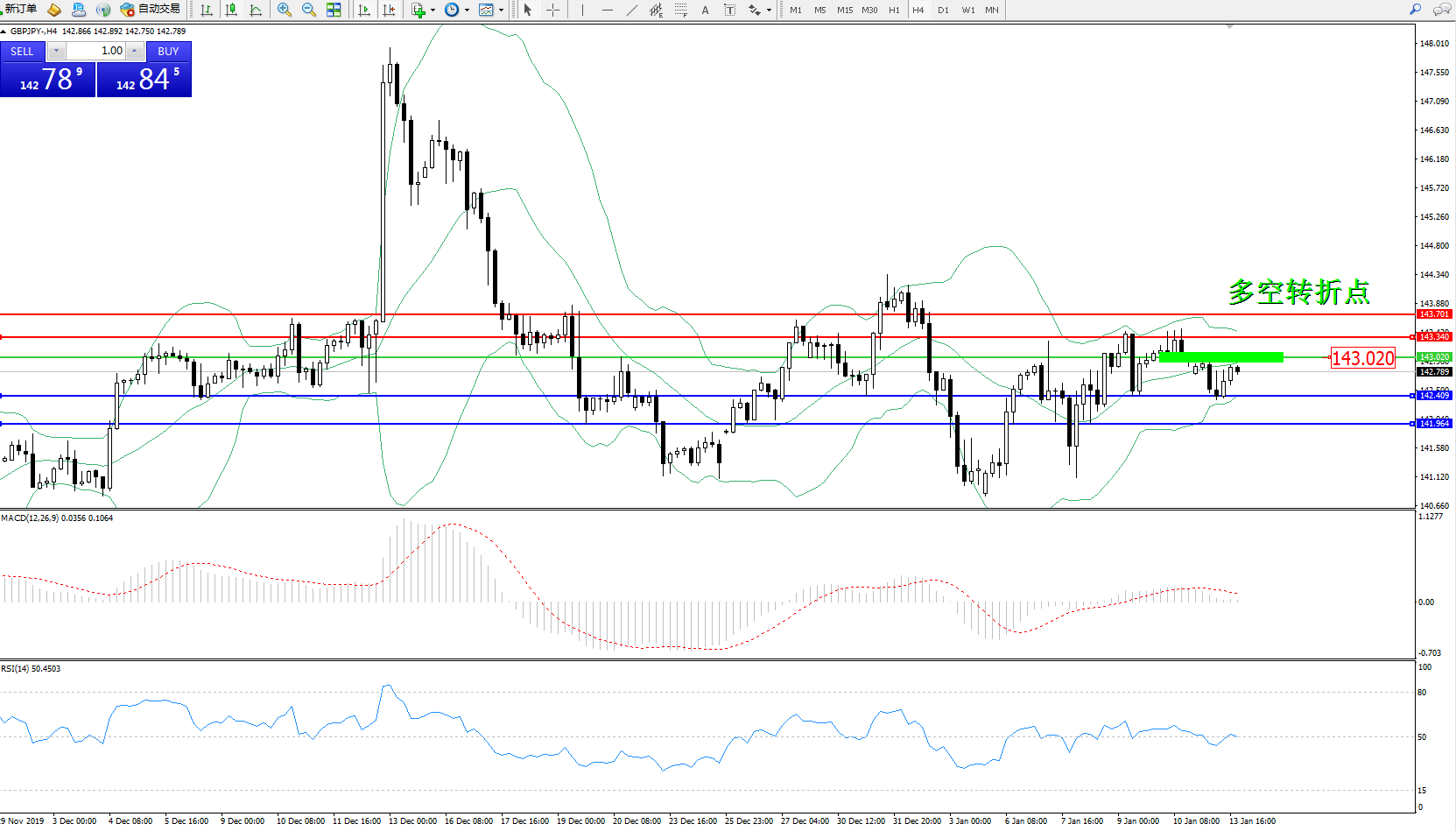 备选策略:143.020上方看涨,目标143.340、143.701