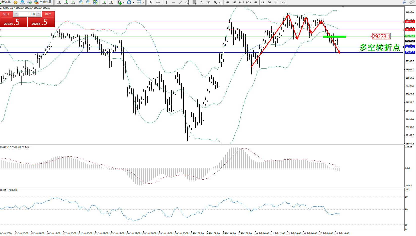 道琼斯指数DJ30—— 4小时K线图显示: