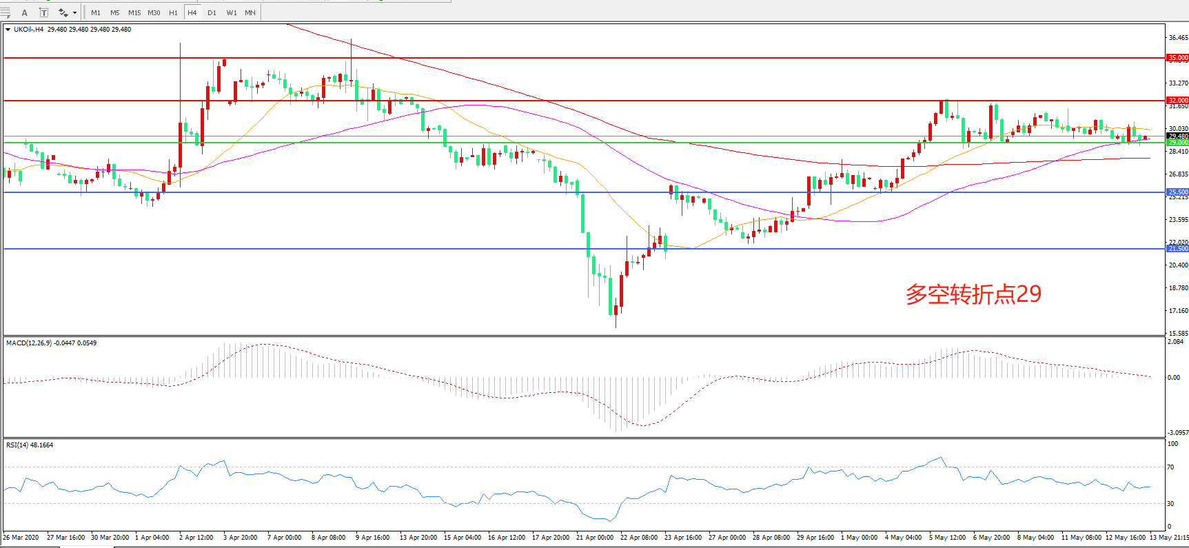 4小时图看,油价延续高位震荡,整体波幅不大,29美元成为短期支撑,均线系统走平,MACD红柱减少,RSI指标向下,日内延续震荡概率较大。