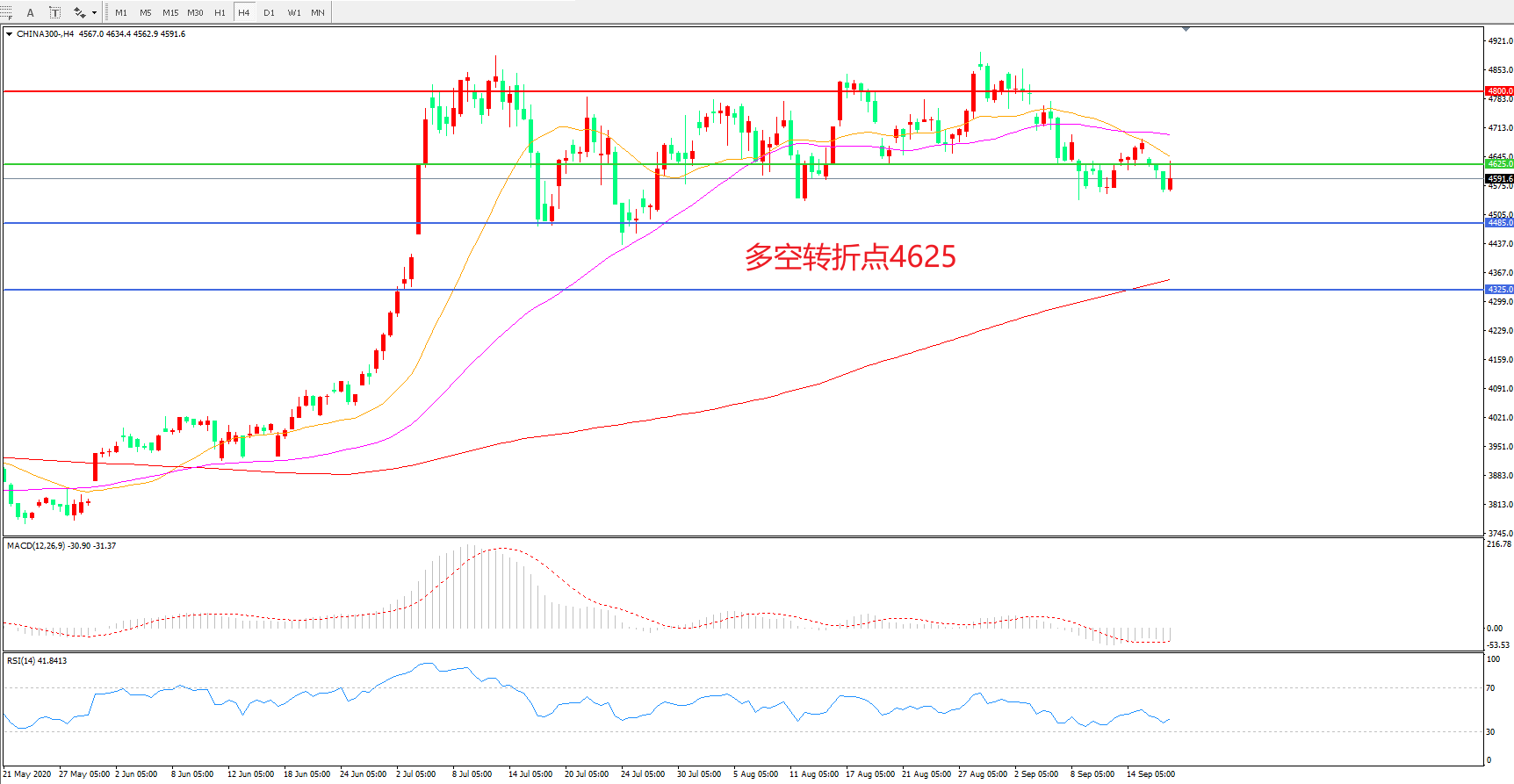 4小时图看,沪深300低开低走,整体表现低迷,4625成为短期多空分水岭,均线系统形成上方阻力, MACD绿柱缩短,RSI指标向上,日内延续震荡概率较大。