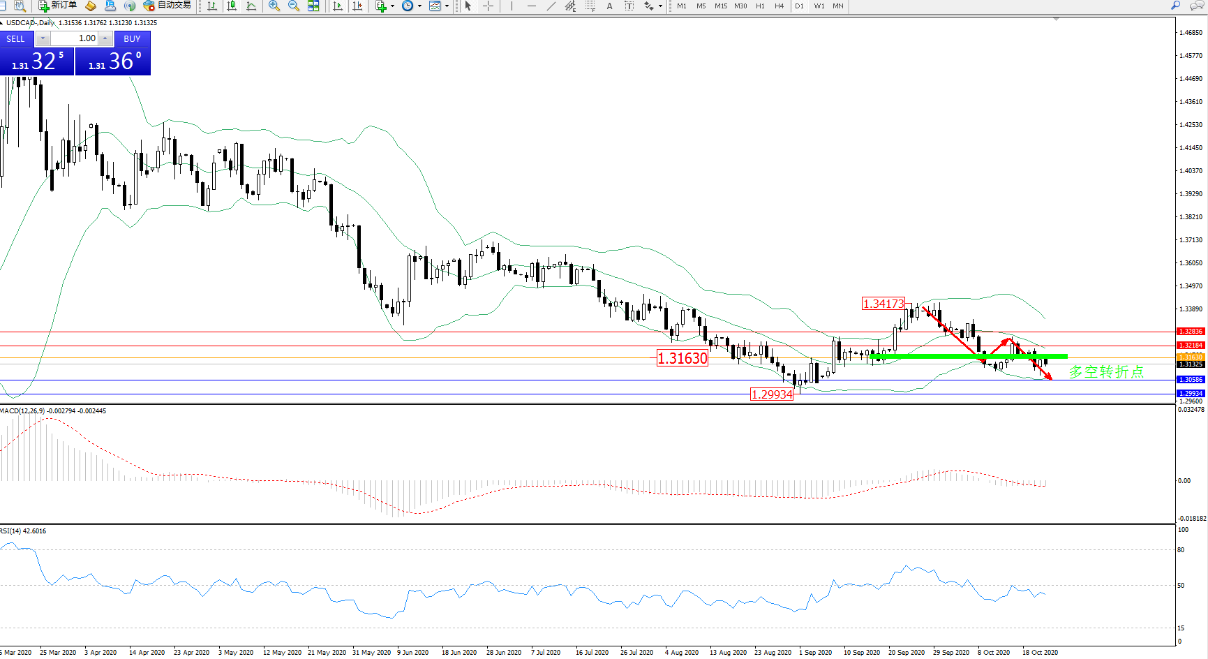 美元加元USDCAD——日K线图显示: