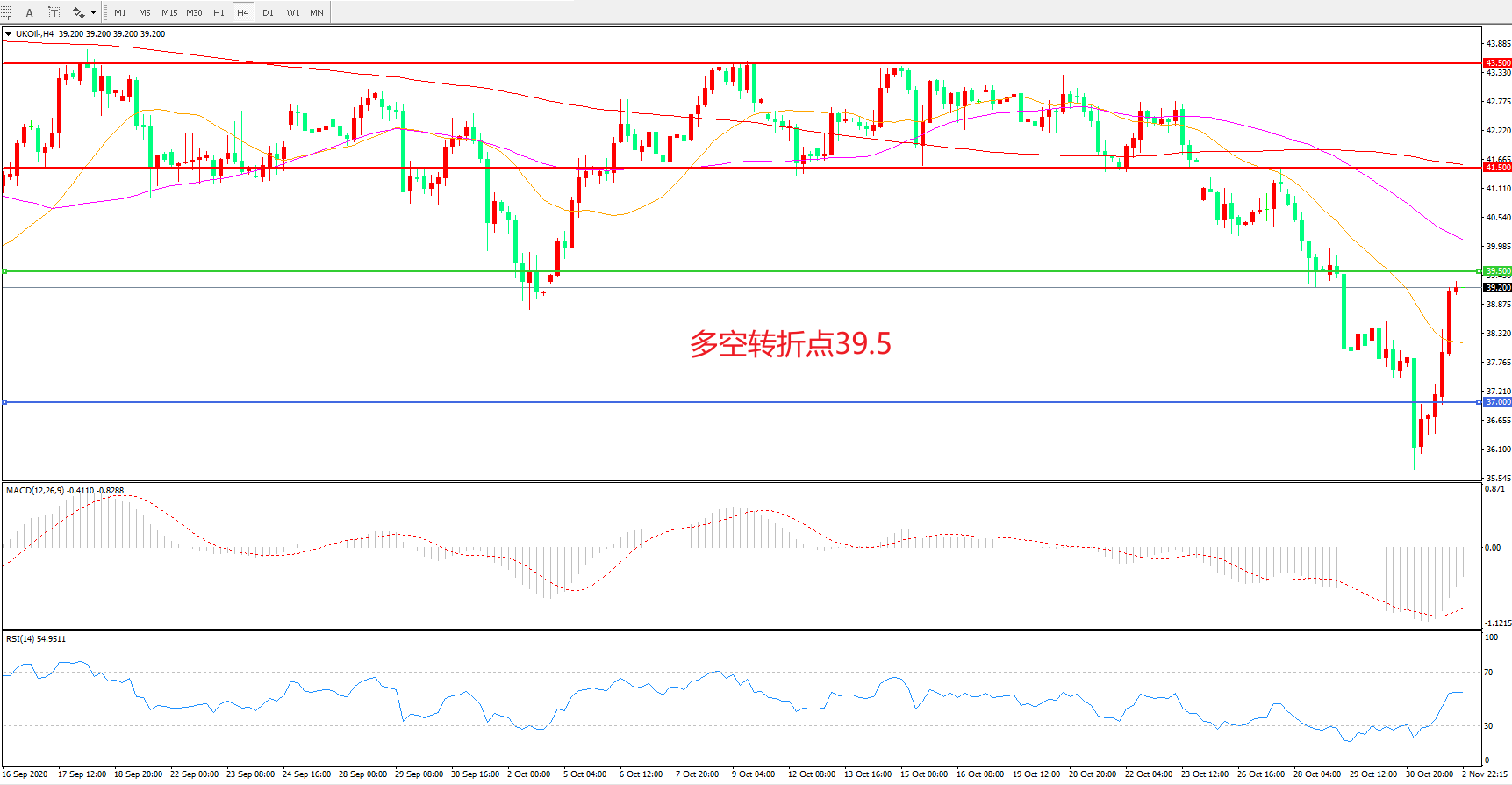 交易策略:  在39.50  之下看跌,目标37.00       33.50
