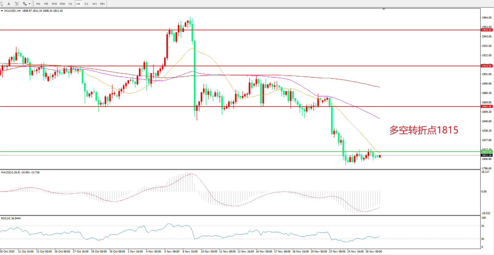 周四(11月26日),由于美元指数延续低位震荡,疫情复发令市场预期主要经济体将推出更多财政和货币刺激措施,现货黄金自低位企稳,收报1810.31美元/盎司。目前欧美新一轮救助措施的推进遭遇阻力,欧盟内部对于救助措施存在分歧,美国两党仍未从大选的震荡中恢复实质接触,预计短期调整仍将持续一段时间。