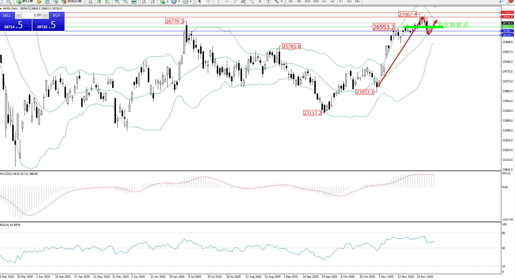 技术点评:多头动力延续布林带指标中上轨区间持续震荡上扬后,高位抵达27067位置遇阻开始震荡下行,触及布林带指标中轨附近节点后开始窄幅整理,高位空头动力短暂回撤后开始整理有继续回升迹象,布林带指标呈收口走势中,MACD指标处于多头区域高位持续整理平移后有下行迹象,RSI指标处于多头区域高位持续整理下移后徘徊;