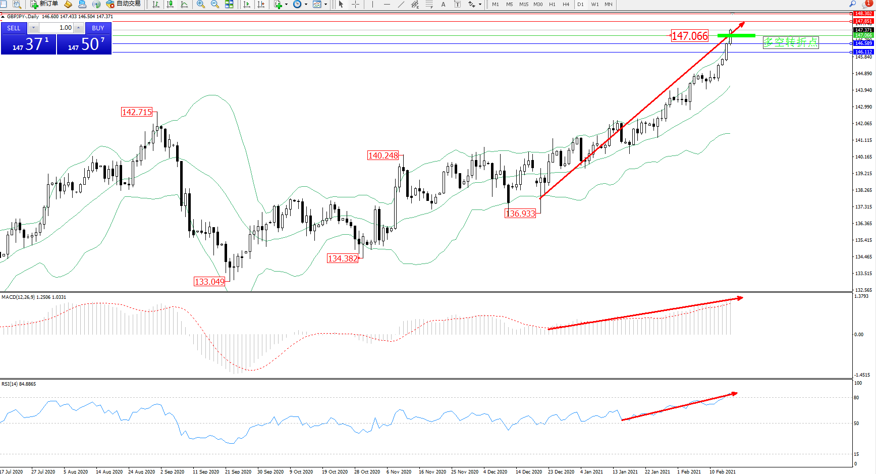 交易策略:147.066上方看涨,目标147.851、148.302