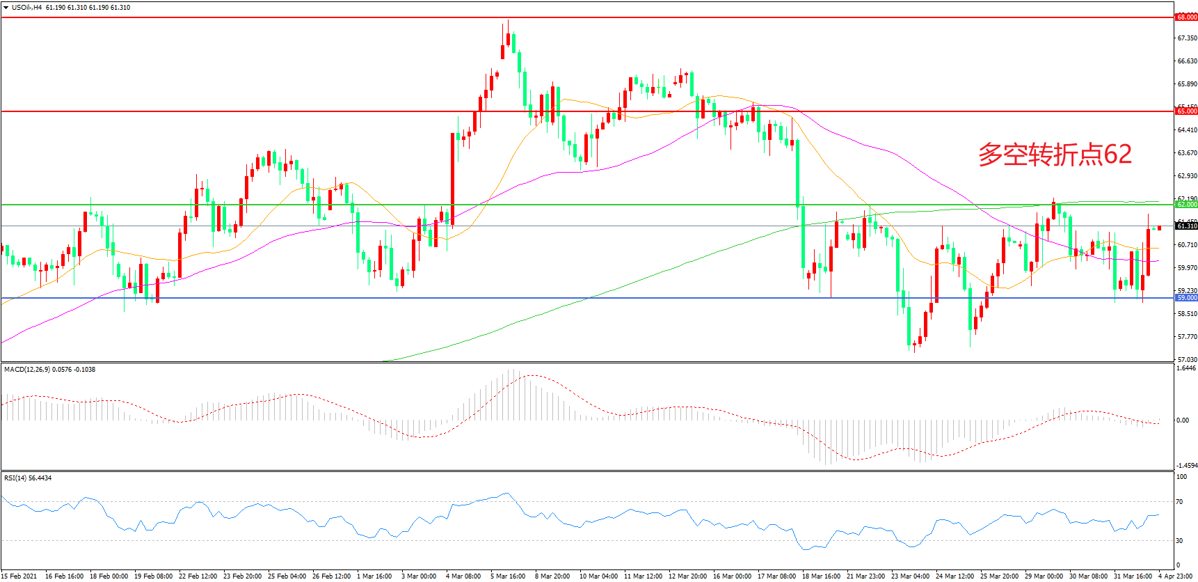 4小时图看,油价延续宽幅震荡走势,59美元成为下方支撑,62美元成为上方阻力,均线系统走平,MACD红柱缩短,RSI指标走平,日内延续震荡概率较大。