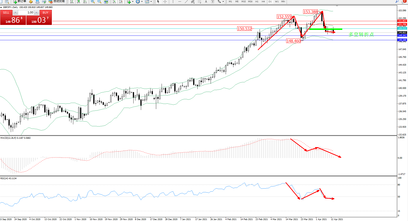 技术点评:多头动力延续布林带指标通道持续震荡上扬,高位抵达153.388位置节点遇阻回撤,急速下挫至中下轨区间震荡下行中,空头动力日渐强劲,布林带指标不断拉升上扬后,高位开始有反转平移走势,MACD指标处于多头区域持续震荡向下移动中,RSI指标高位急速下挫至0轴线下方徘徊;