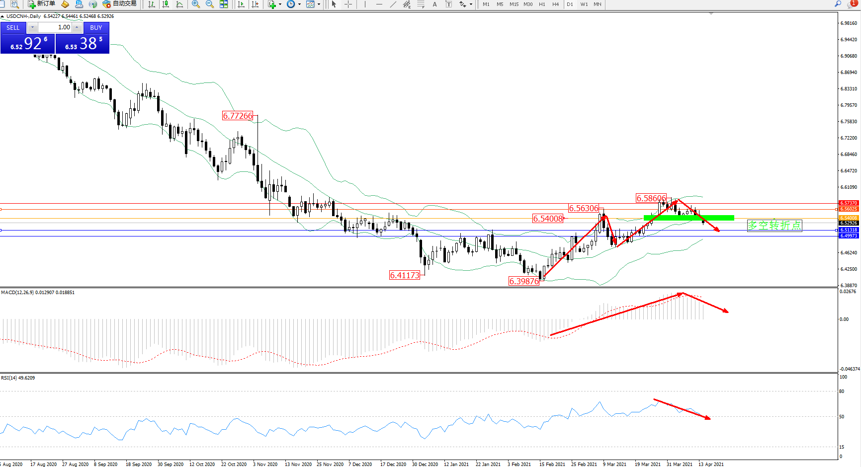 美元人民币USDCNH——日K线图显示:
