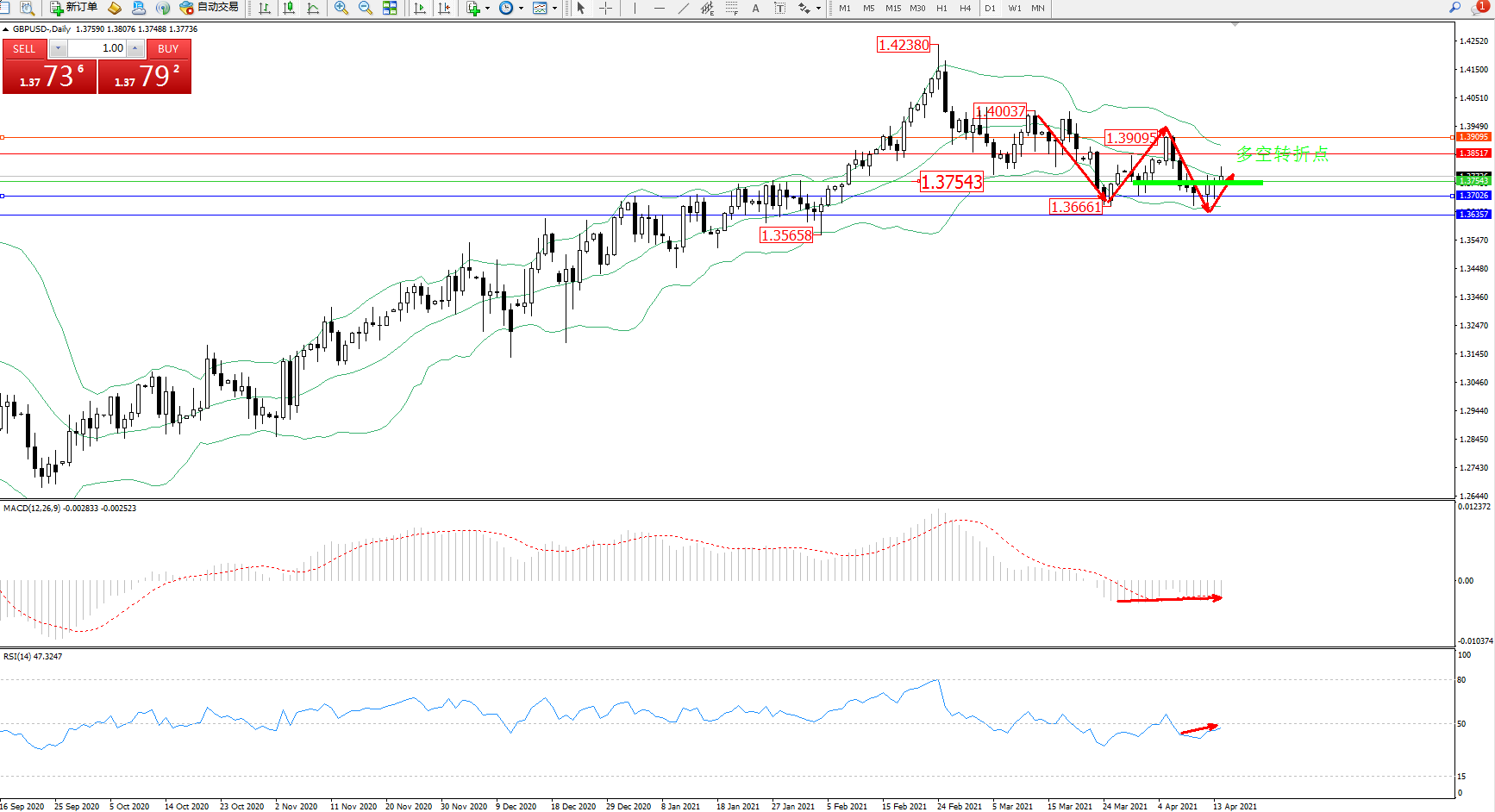 交易策略:1.37543上方看涨,目标1.38517、1.39095