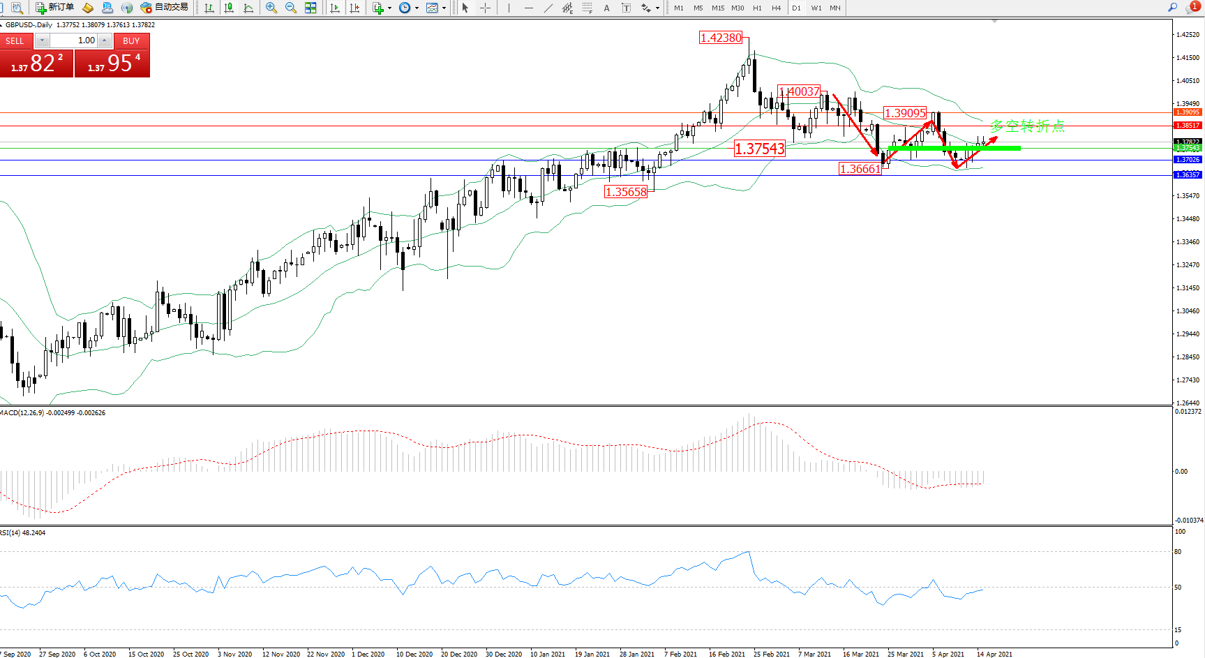 交易策略:1.37543上方看涨,目标1.38517、1.39095