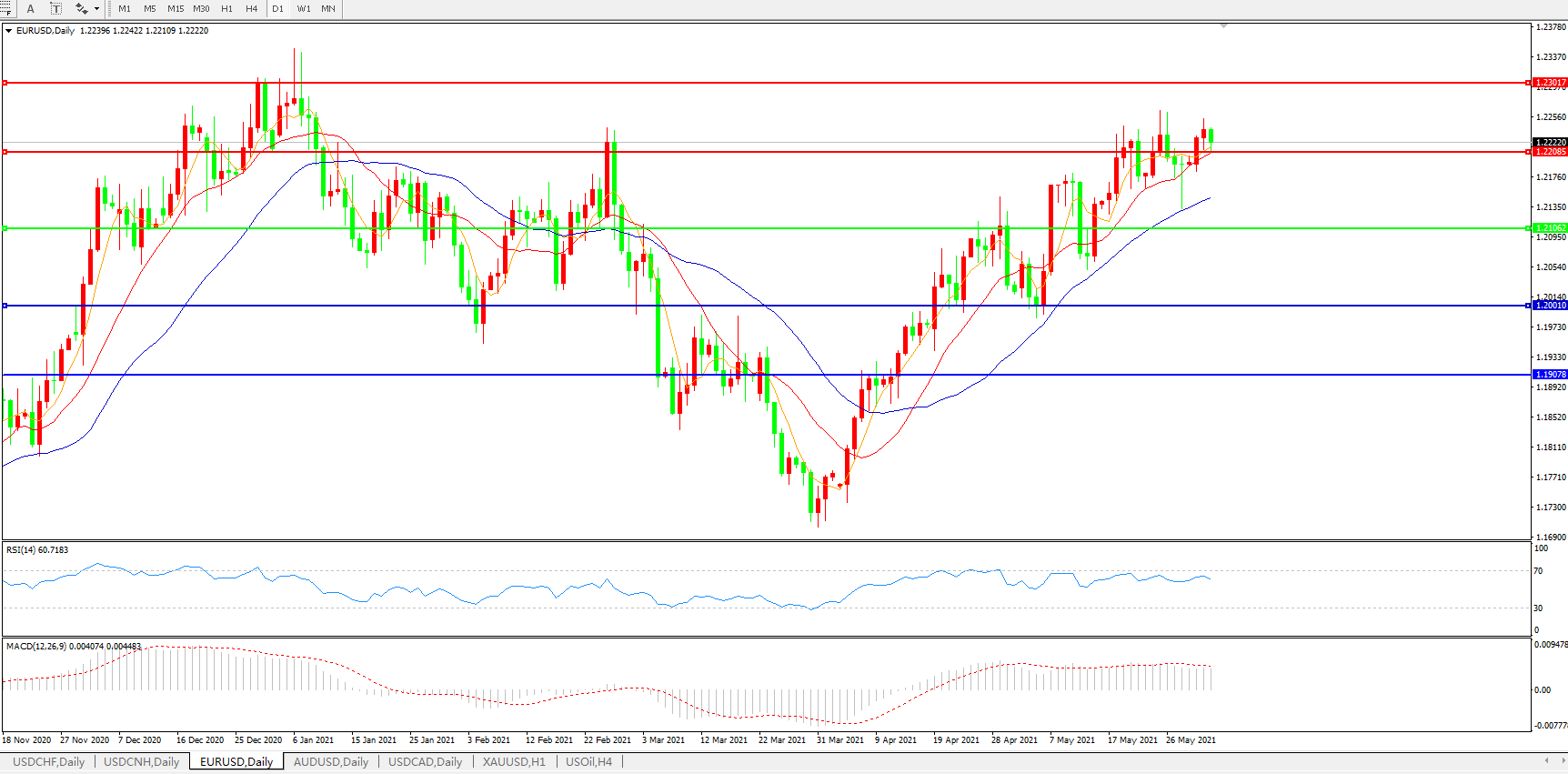 技术面简析:日图均线呈上行态势,汇价偏强整理,MACD运行于0轴上但量能开始微缩量,RSI小幅走弱,预计短期汇价大概率将在整理后进一步上行。