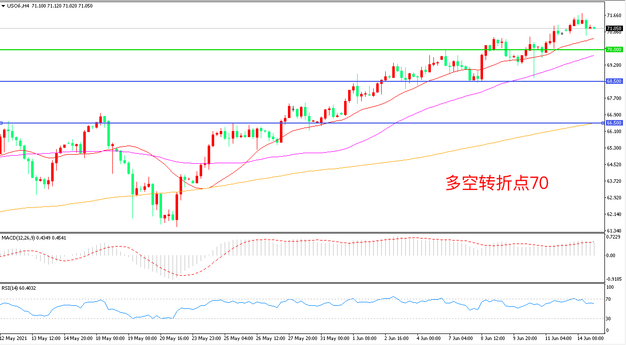 周一(6月14日),欧美经济刺激力度不减,市场对原油市场供需展望乐观,美国WTI原油一度涨逾1%,但在伊朗宣布与美国就解除能源制裁达成广泛协议后,油价回吐部分涨幅,收报71.04美元/盎司。随着疫情重新得到控制,新冠疫苗接种率上升,全球经济增长,原油需求进一步恢复是大势所趋,三季度油价大概率维持高位运行。