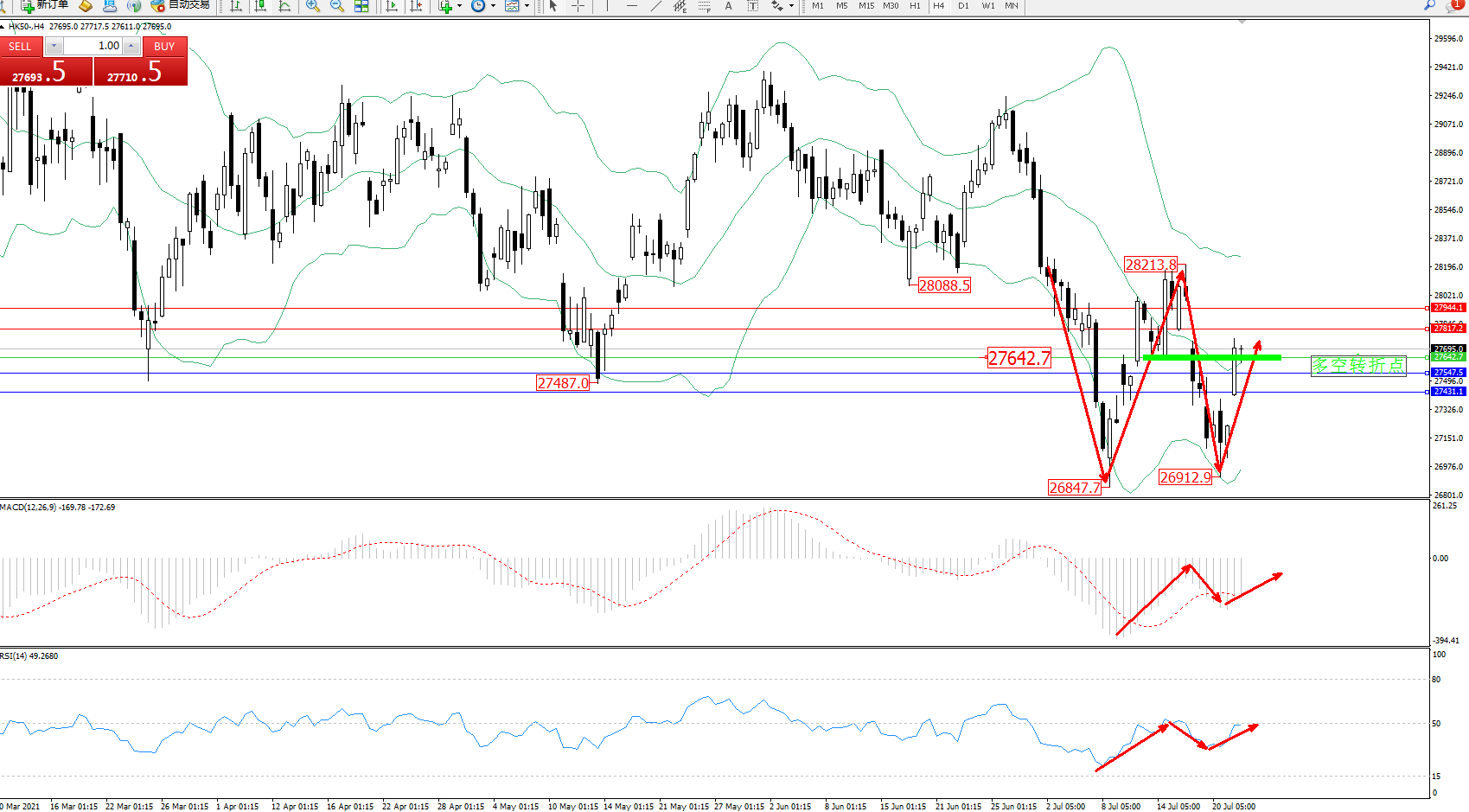恒指HK50 ——4小时K线图显示: