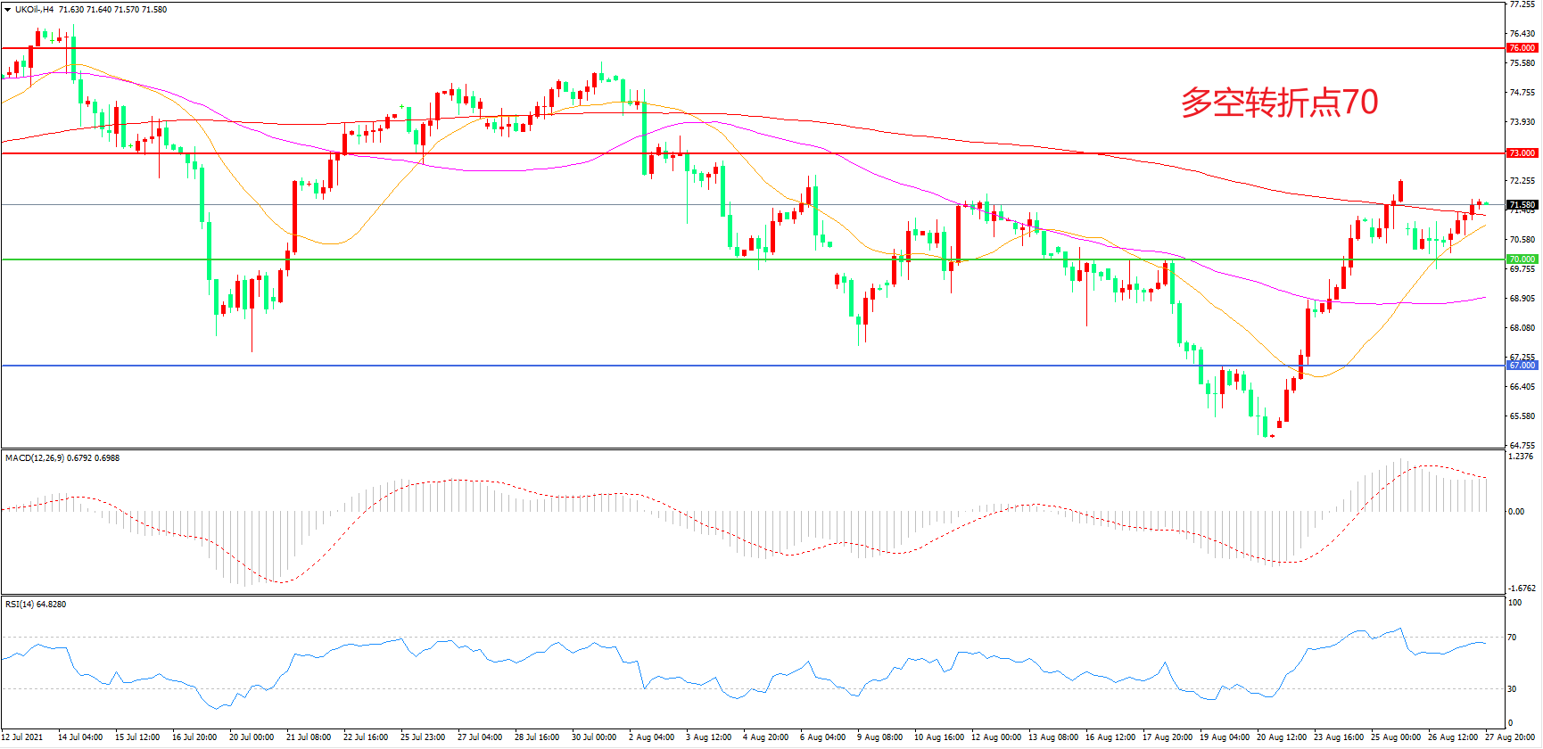 4小时图看,油价突破70美元后延续窄幅震荡,整体表现偏强, 200周期均线被顺利突破,MACD红柱增加,RSI指标走平,日内震荡上行概率较大。