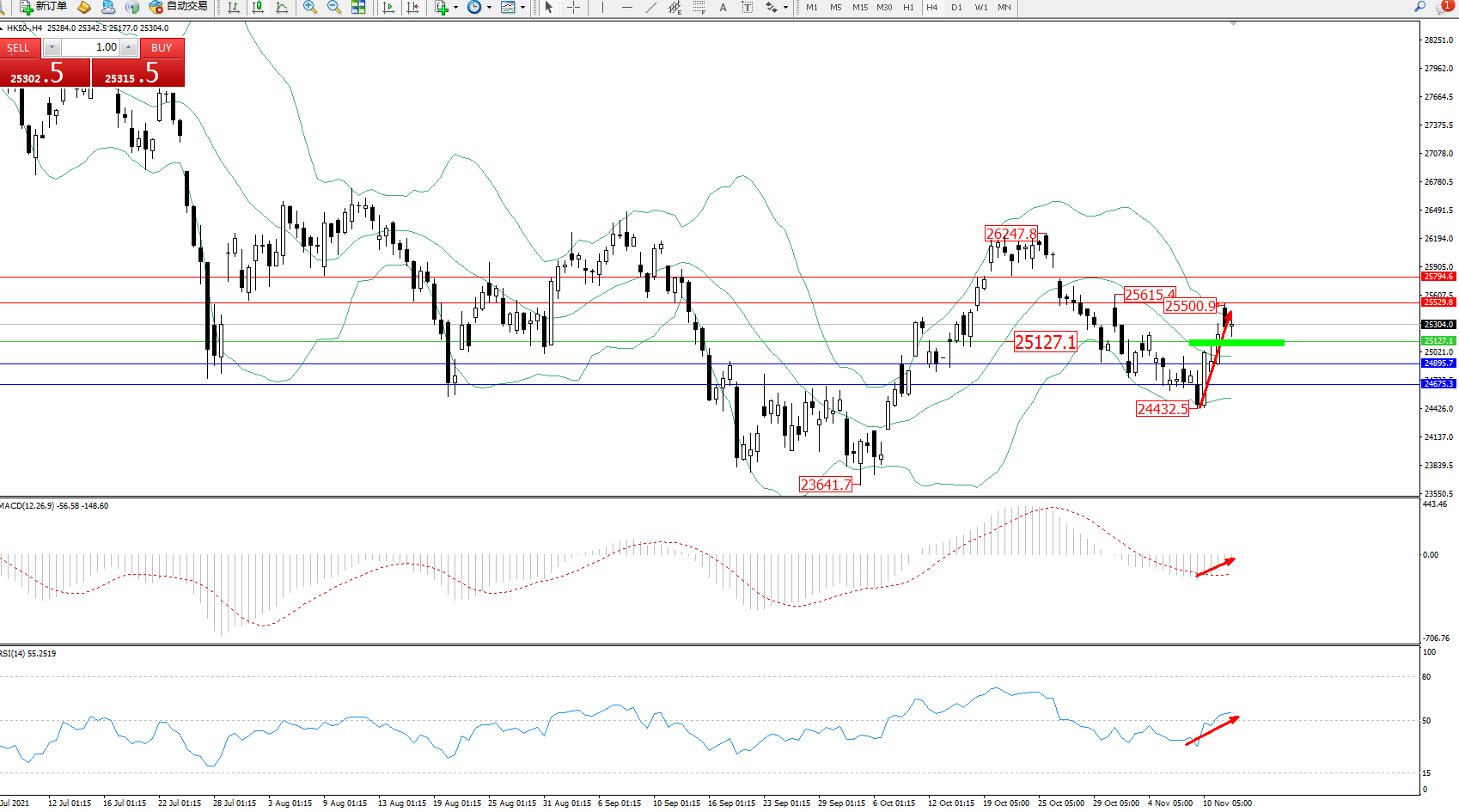 恒指HK50 ——4小时K线图显示: