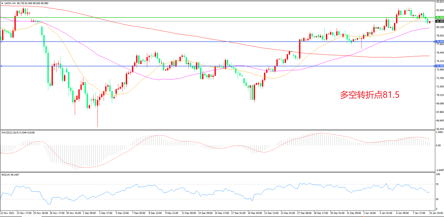 4小时图看,油价触碰80美元后小幅回落,但均线系统仍呈多头排列,55周期均线成为下方支撑,MACD红柱缩短,RSI指标走平,日内延续震荡概率较大。