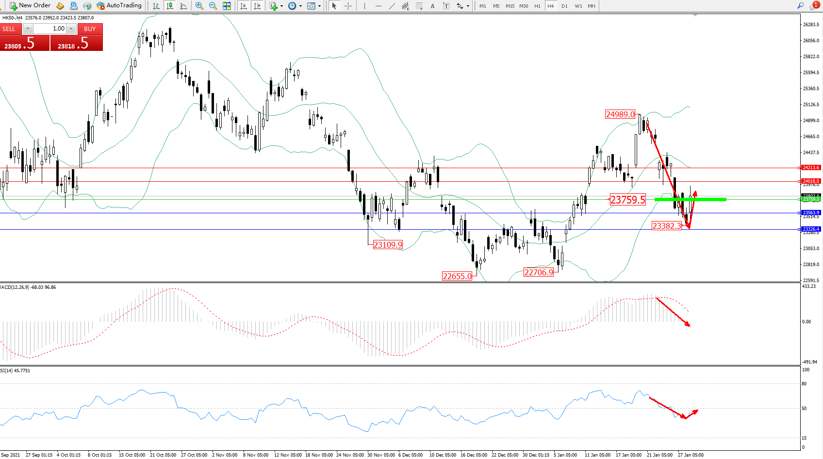 恒指HK50 ——4小时K线图显示: