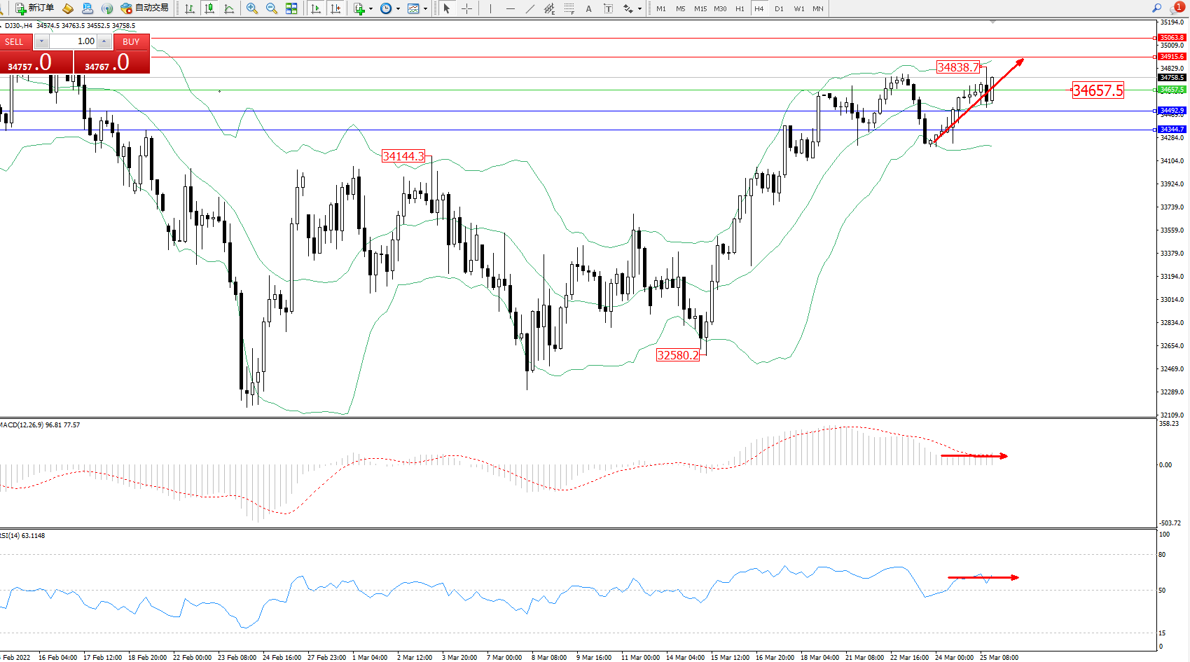 交易策略:34657上方看涨,目标34915、35063