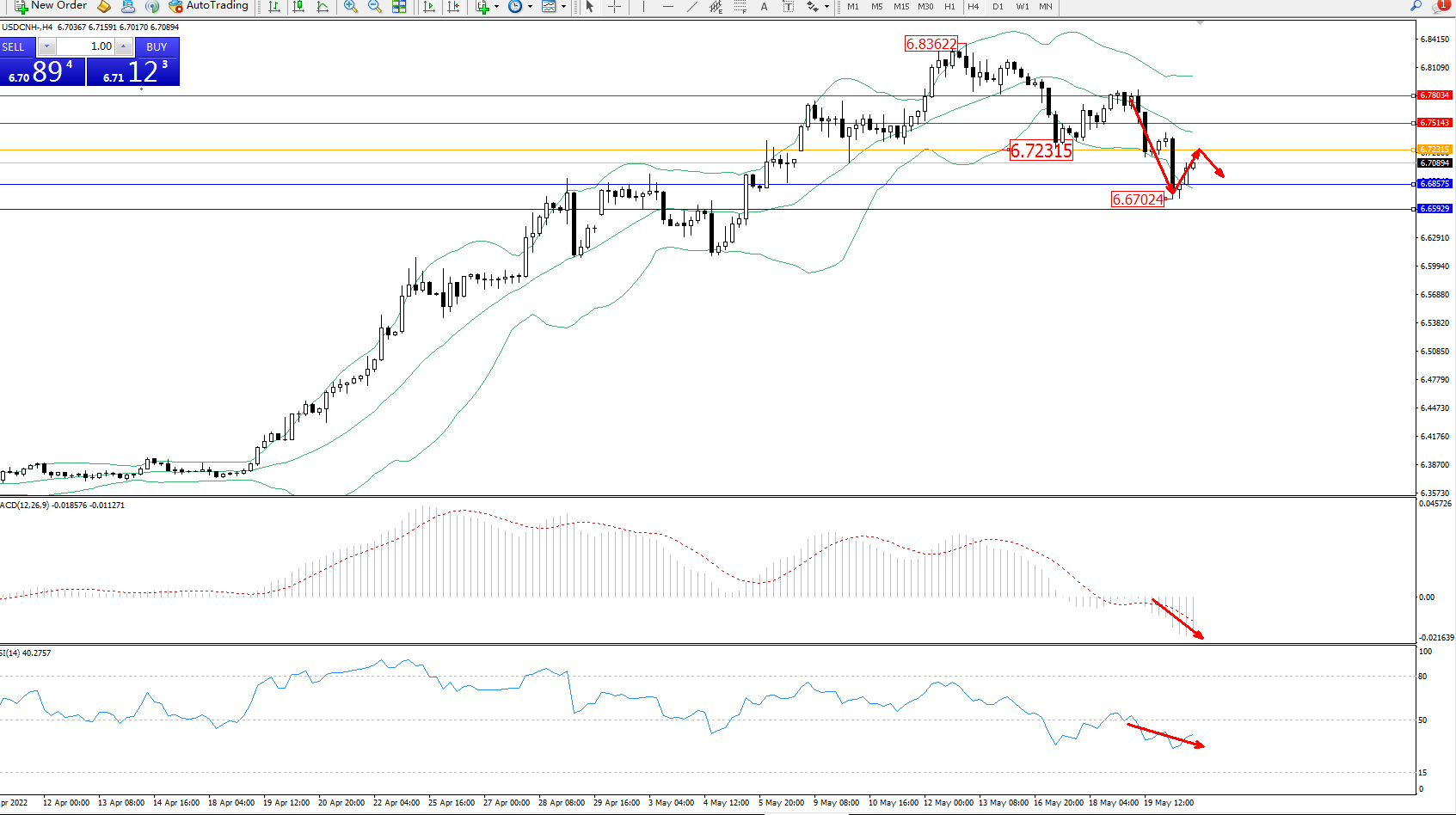 美元人民币USDCNH——4小时K线图显示: