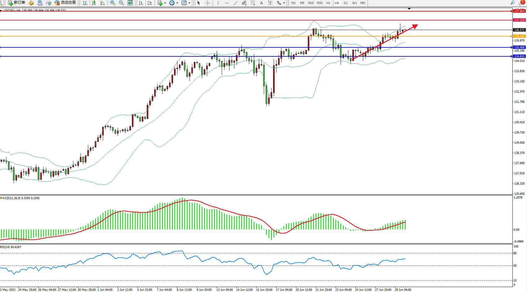 交易策略:136.142上方看涨,目标137.120、137.814
