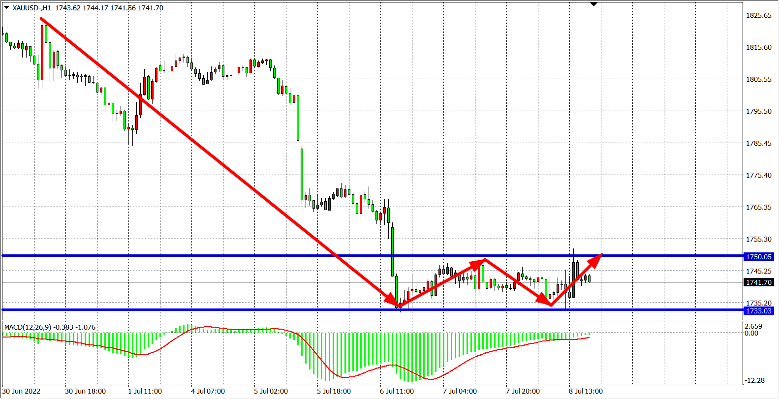 交易策略:在1733.00之下看跌,目标1720.00          1700.00