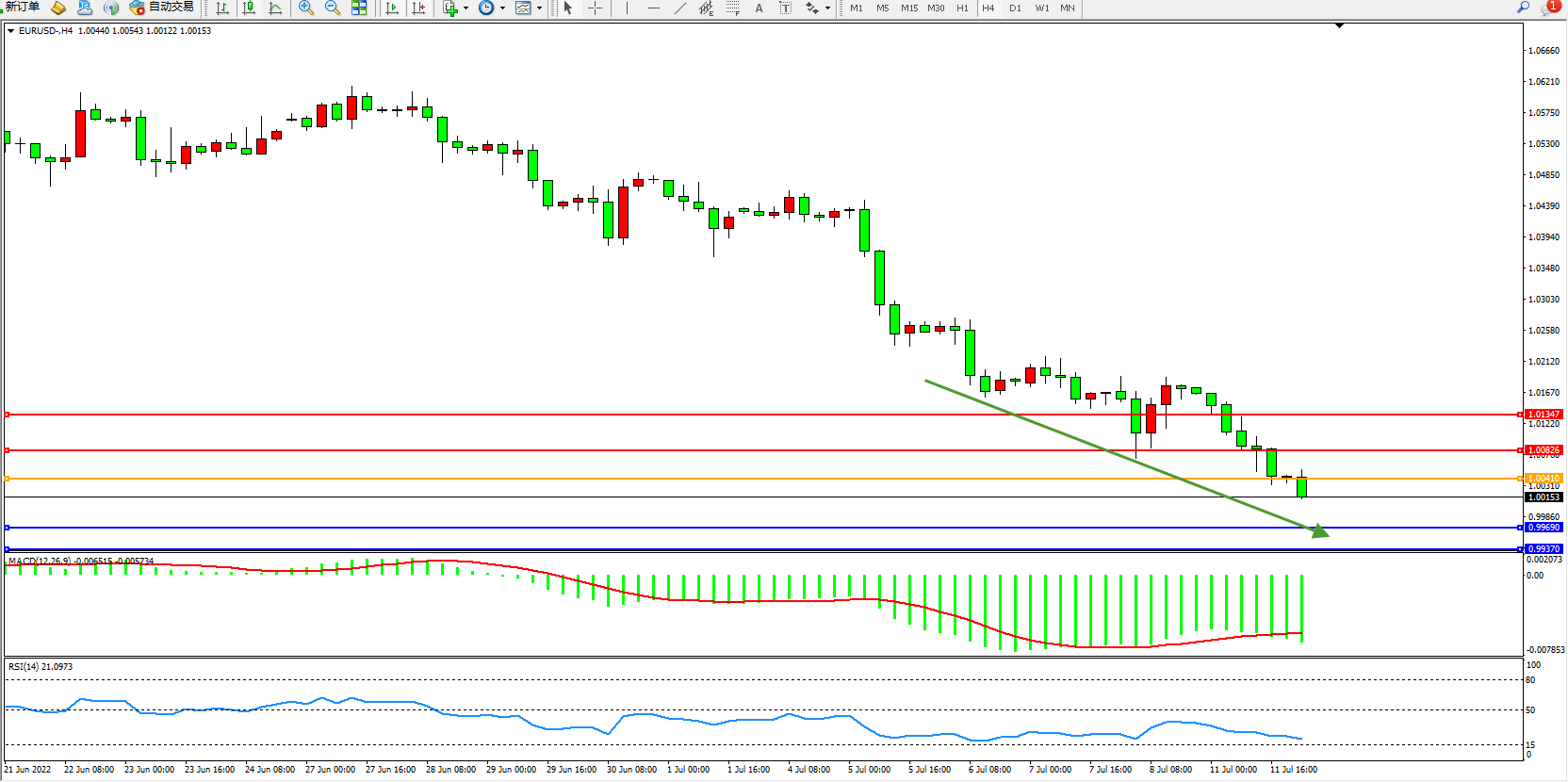 4小时图看:空头动力延续空头下行态势良好,低位即将跌近平价,MACD指标处于空头区域低位维持整理平移,RSI指标处于空头区域维持弱势下行中;
