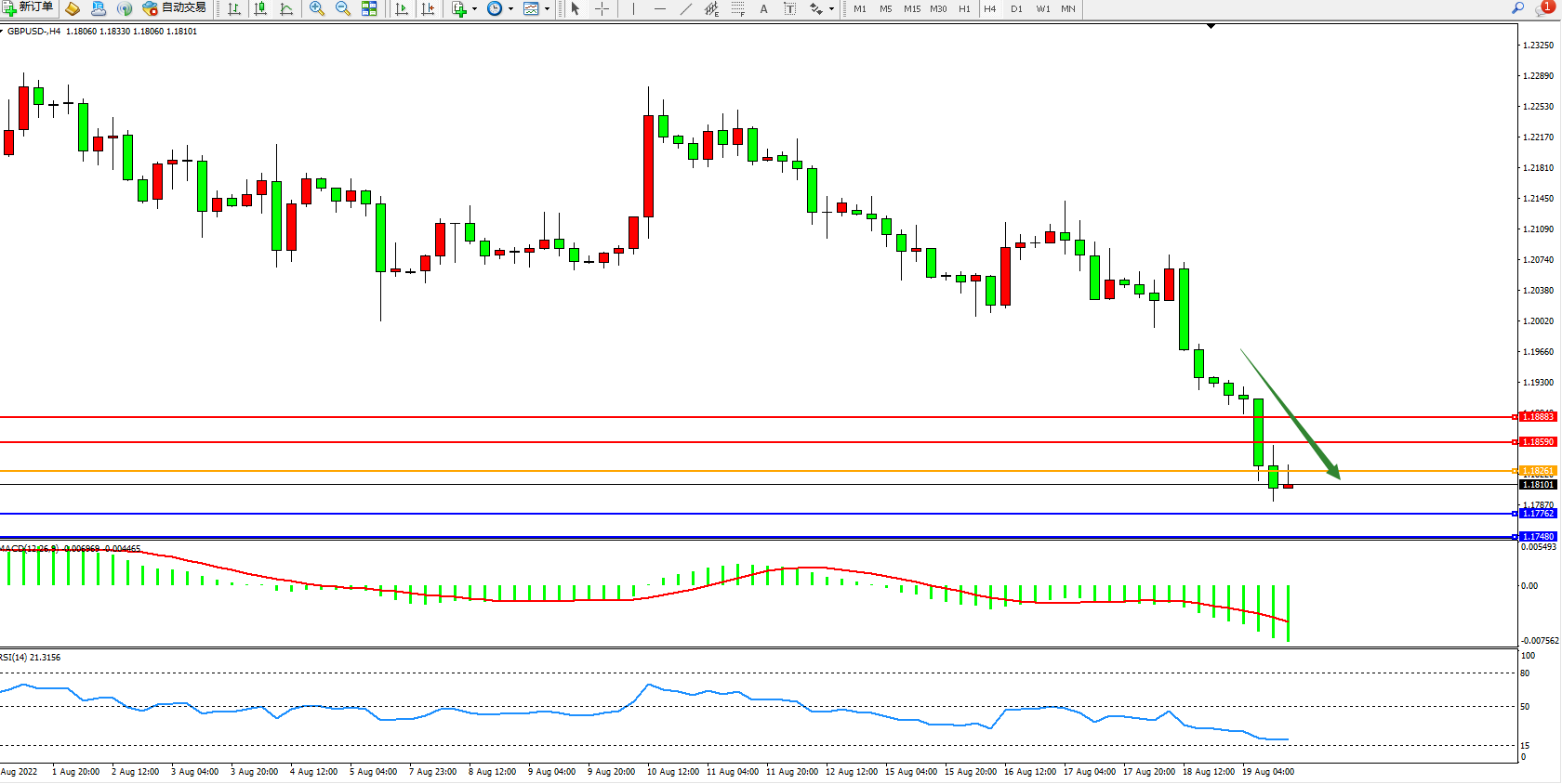 交易策略:1.18261下方看跌,目标1.17762、1.17480