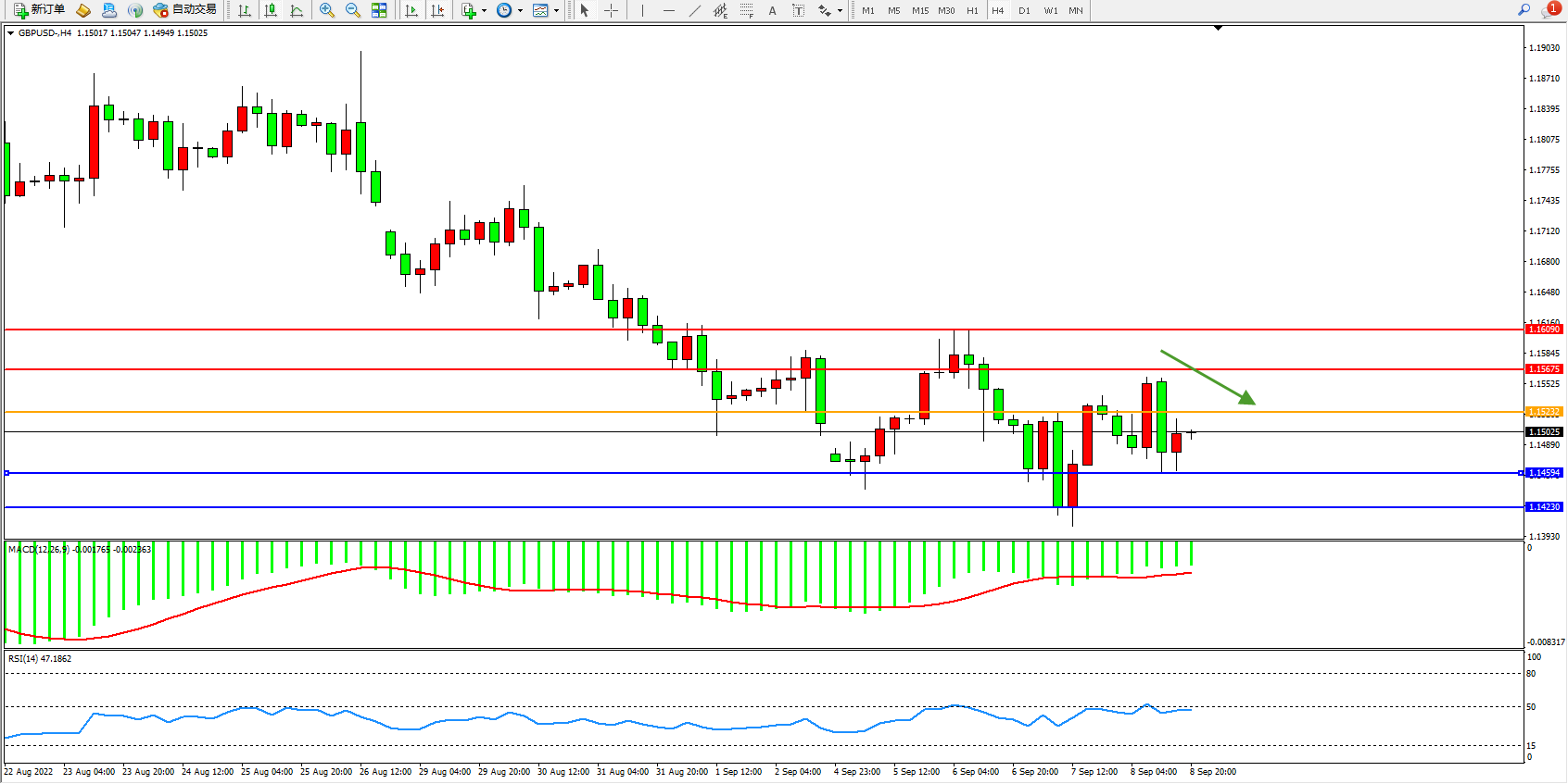 交易策略:1.15232下方看跌,目标1.14594、1.14230