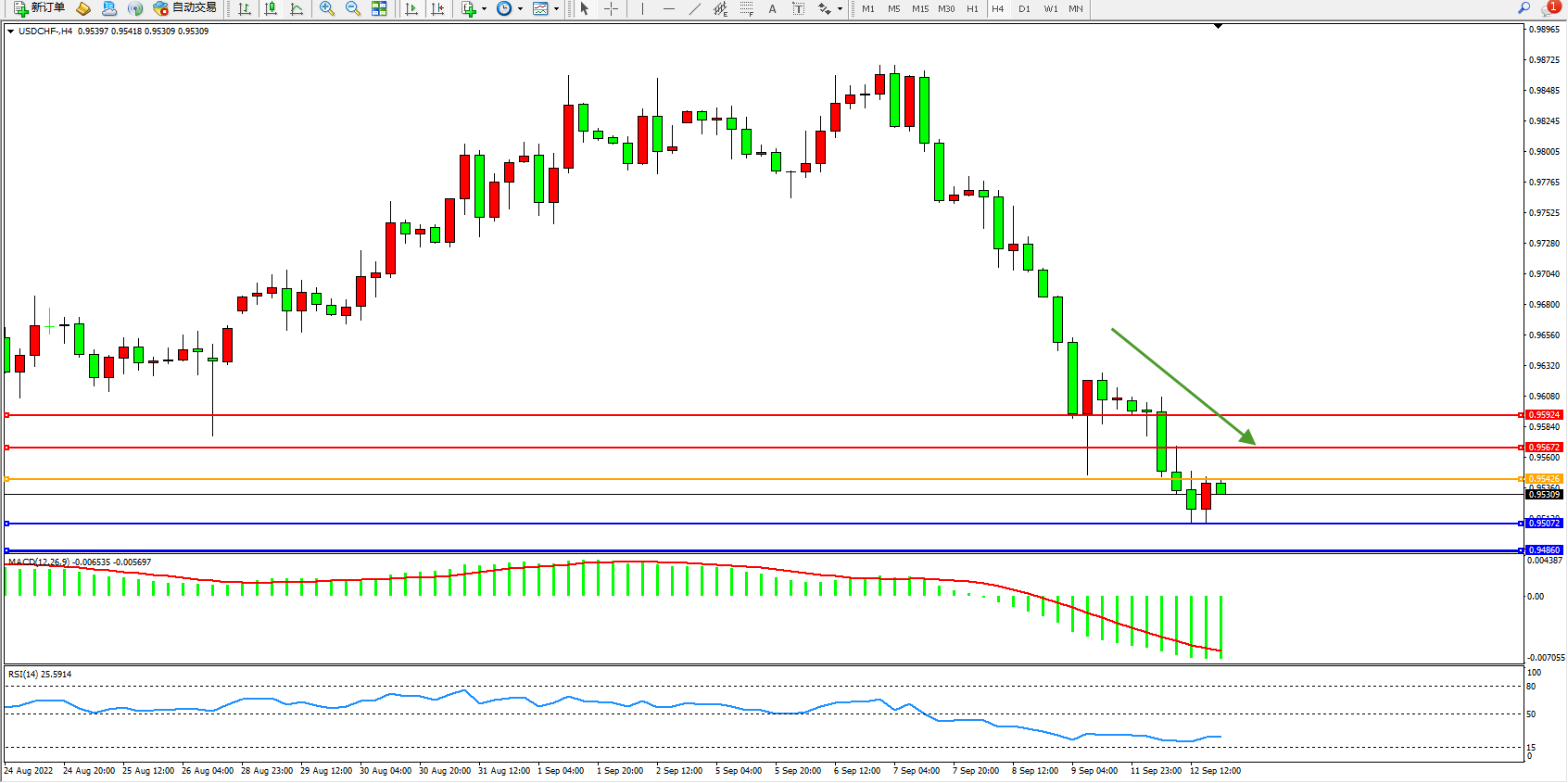 美元瑞郎USDCHF——4小时K线图显示: