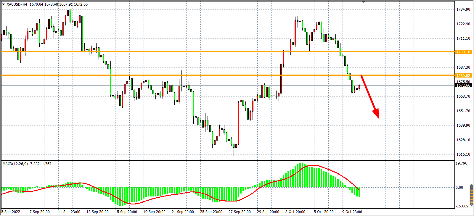 4小时图看,金价在跌破1700后加速下行,MACD于零轴之下也开始放量,显示行情有进一步走低空间,目前阻力已下移至1680,日内再该位之下以看跌为主,下方目标1660-1640。
